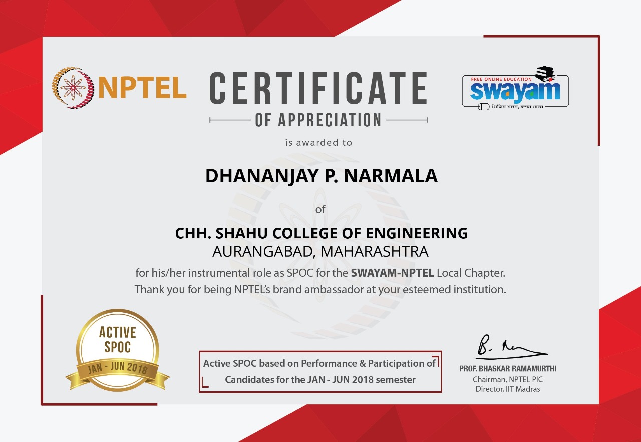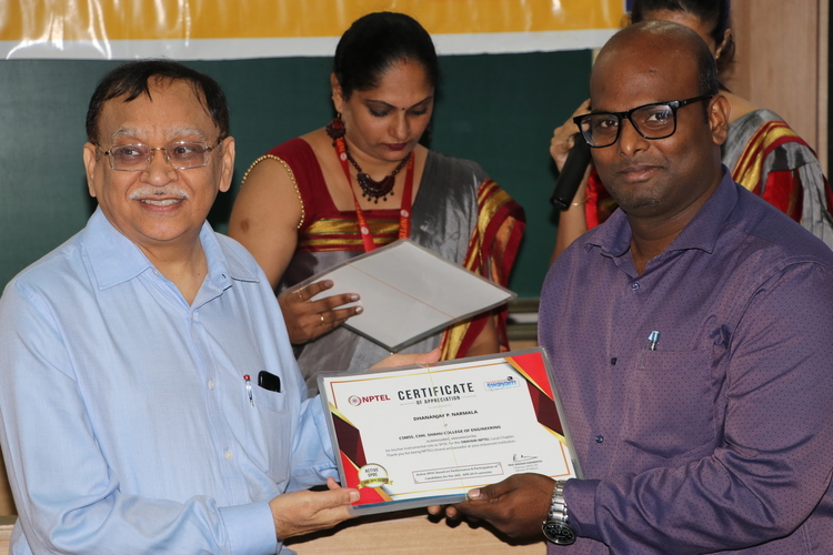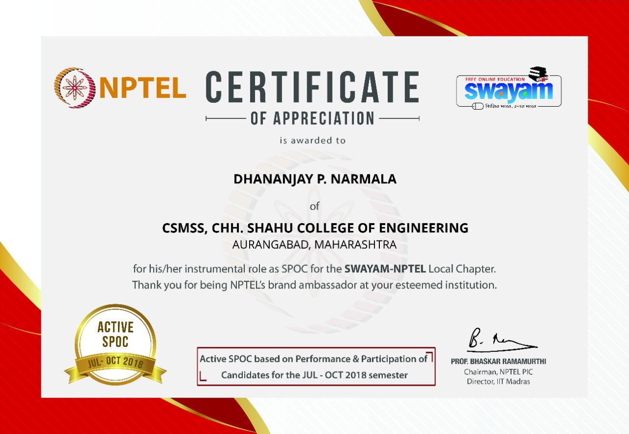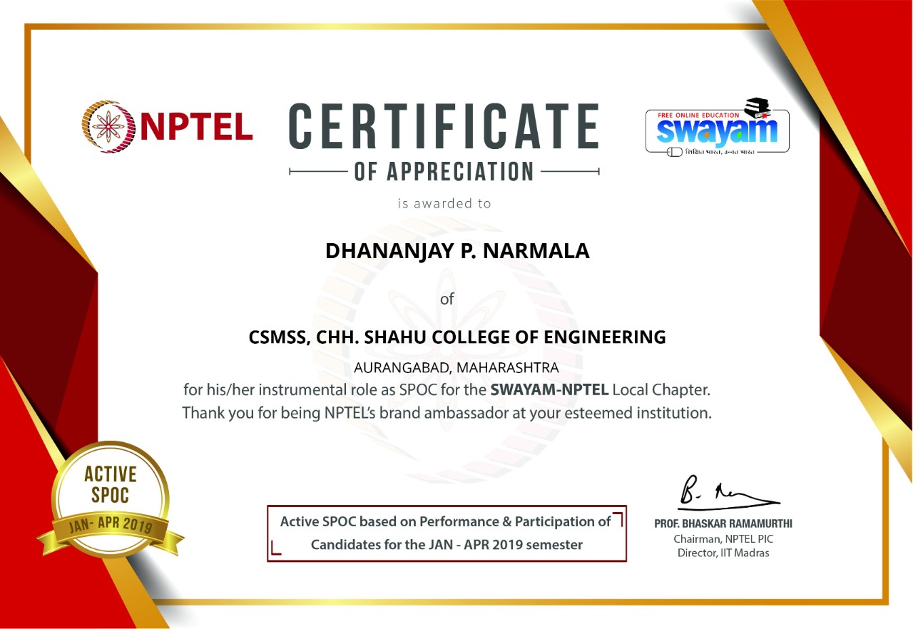 The National Programme on Technology Enhanced Learning (NPTEL) was initiated by seven Indian Institutes of Technology (Bombay, Delhi, Kanpur, Kharagpur, Madras, Guwahati and Roorkee) along with the Indian Institute of Science, Bangalore in 2003 has been offering self-study courses across engineering, humanities and science streams for more than a decade. From March 2014 NPTEL has been offering online certification for its courses, the highlight being the certification exam through which the faculty and student gets an opportunity to earn a certificate from the IITs! CSMSS Chh.shahu college of Engineering Chhatrapati Sambhajinagar (Aurangabad) was partnering as SWAYAM-NPTEL Local Chapter since November-2017.